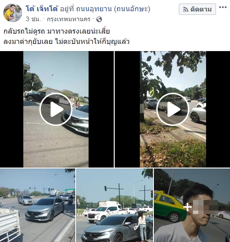 พร้อมเขียนแคปชั่นว่า "กลับรถไม่ดูรถ มาทางตรงเลยน่ะเสี่ย ลงมาด่ากูยับเลย