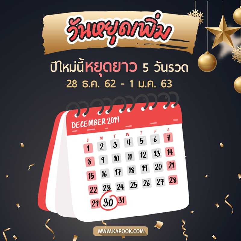 รวมเป็นวันหยุด 5 วัน ตั้งแต่วันเสาร์ที่ 28 ธันวาคม 2562 ถึงวันพุธที่ 1