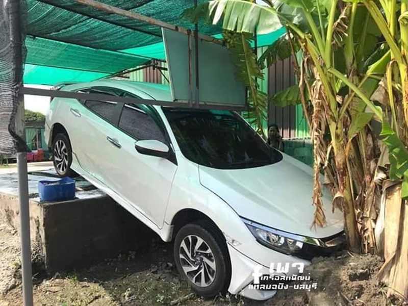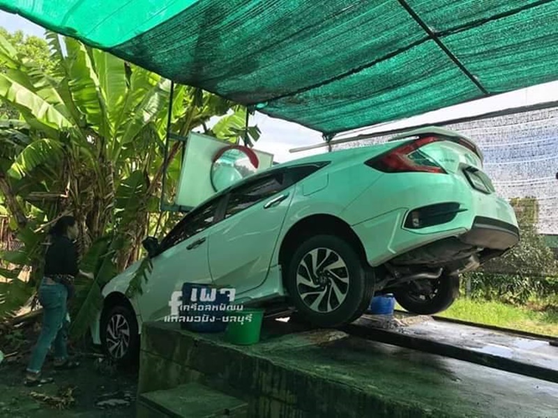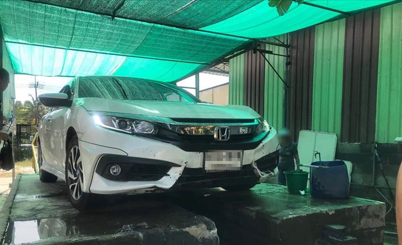 ลูกค้าเข่าแทบทรุด พนักงานคาร์แคร์ขับรถขึ้นแท่นล้าง คาดไม่ชินระบบเกียร์ออโต้ พาซีวิคพุ่งชนดงกล้วย หน้ารถยับยู่ แนะเลือกร้านที่มีความชำนาญ