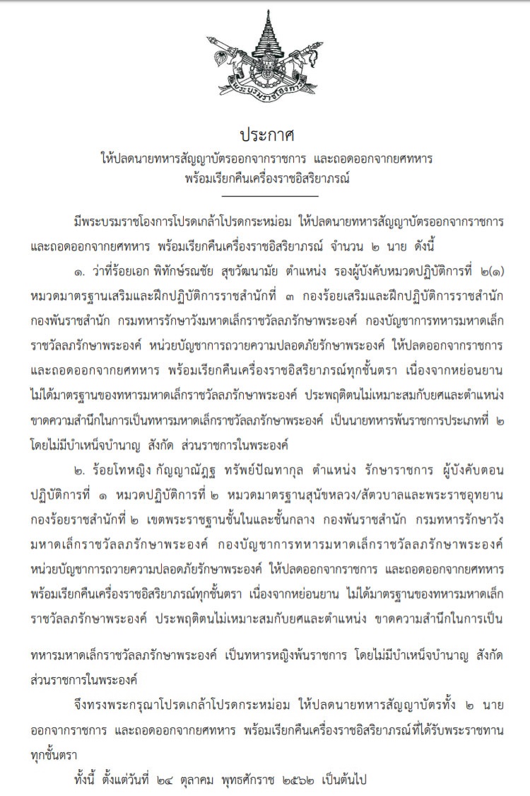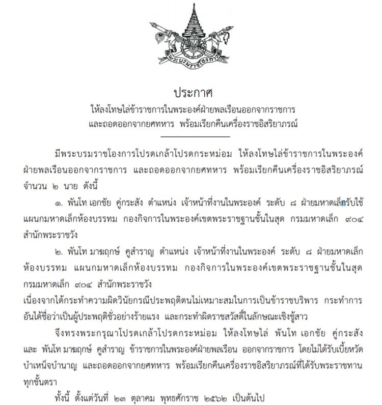 วันที่ 29 ตุลาคม 2562 ราชกิจจานุเบกษา เผยแพร่ประกาศ ให้ลงโทษไล่ข้าราชการในพระองค์ฝ่ายพลเรือนออกจากราชการ และถอดออกจากยศทหาร พร้อมเรียกคืนเครื่องราชอิสริยาภรณ์ ความว่า มีพระบรมราชโองการโปรดเกล้าโปรดกระหม่อม ให้ลงโทษไล่ข้าราชการในพระองค์ฝ่ายพลเรือนออกจากราชการ และถอดออกจากยศทหาร พร้อมเรียกคืนเครื่องราชอิสริยาภรณ์ จำนวน 2 นาย ดังนี้