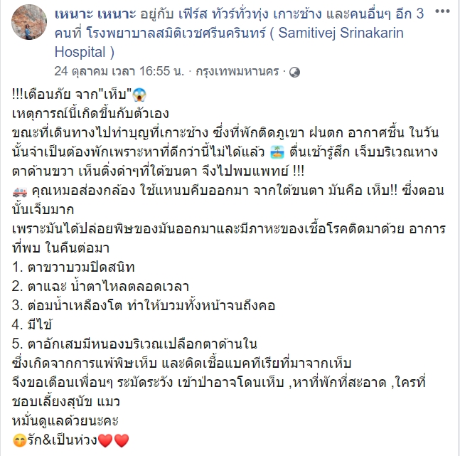 สาวเล่าอุทาหรณ์เตือนภัยจากเห็บ หลังเข้าพักที่เกาะช้าง เจอเห็บเกาะใต้ขนตา ก่อนถูกปล่อยพิษใส่ กัดตาบวมปิด ต่อมน้ำเหลืองโต ตาอักเสบมีหนอง เนื่องจากแพ้พิษเห็บ