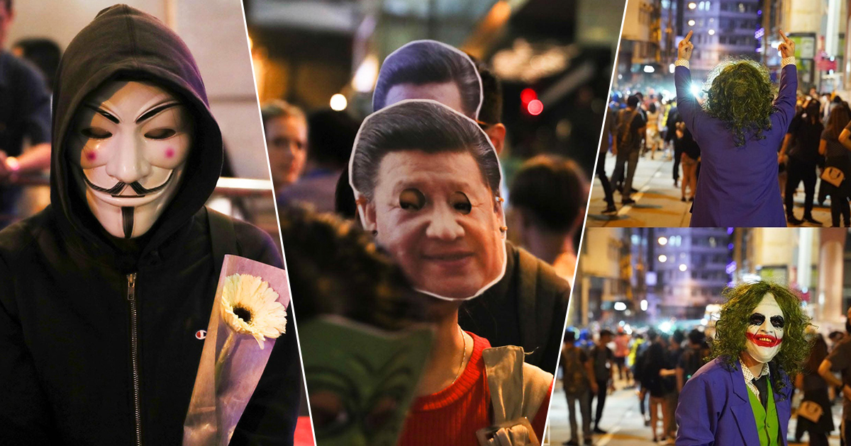 โดยบรรดาผู้ประท้วงดังกล่าว บางรายเพนต์หน้าผี แต่งคอสเพลย์ ขณะที่บางรายใส่หน้ากากล้อเลียนบุคคลต่าง ๆ ทั้ง สิน จี้ผิง ประธานาธิบดีจีน และแคร์รี แลม ผู้บริหารสูงสุดของฮ่องกง รวมทั้งนักการเมืองคนอื่น ๆ ซึ่งถือว่าผิดกฎหมายการห้ามสวมหน้ากากชุมนุมในที่สาธารณะ