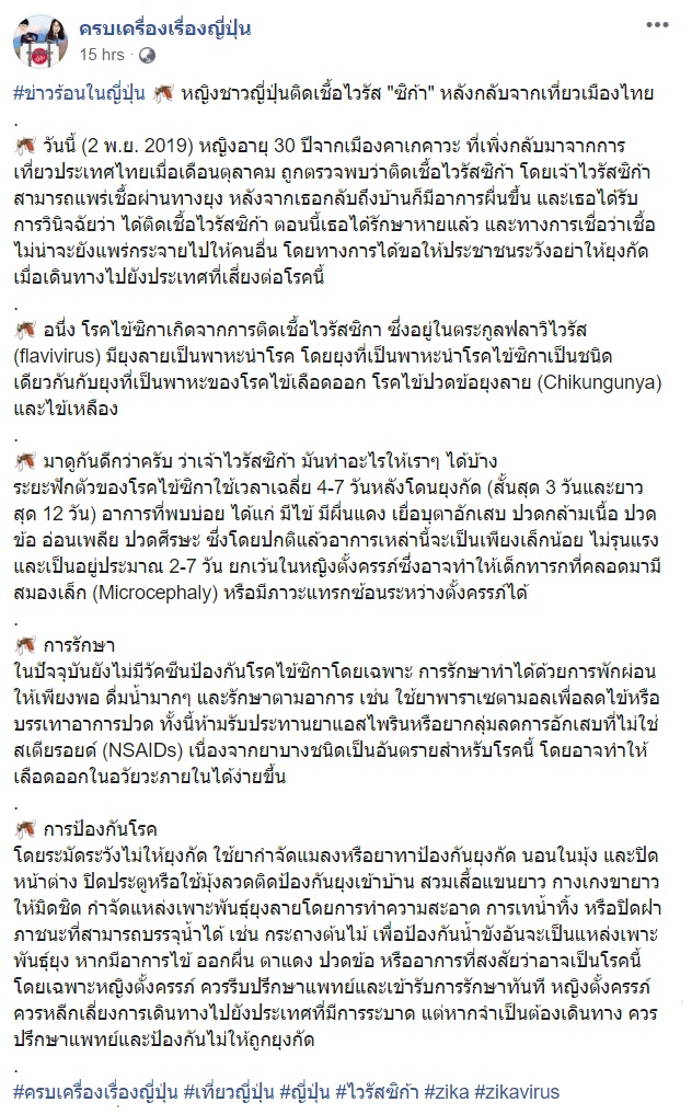 เพจดังเผย สื่อญี่ปุ่นตีข่าว นักท่องเที่ยวสาวญี่ปุ่นติดไวรัสซิกา หลังไปเที่ยวประเทศไทย เผยเกิดจากการยุงกัด ล่าสุดหญิงสาวหายดีแล้ว