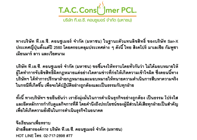 วันที่ 5 พฤศจิกายน 2562 บริษัท ที.เอ.ซี. คอนซูเมอร์ จำกัด (มหาชน) ได้ออกแถลงการณ์ระบุว่า ในฐานะตัวแทนลิขสิทธิ์ ของบริษัท San-X ประเทศญี่ปุ่นตั้งแต่ปี 2560 โดยครอบคลุมประเทศต่าง ๆ ดังนี้ ไทย สิงคโปร์ มาเลเซีย กัมพูชา เมียนมาร์ ลาว และเวียดนาม