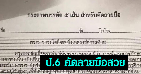 เด็ก ป.6 คัดลายมือคว้าที่ 1 ระดับเขต สวยงามจนต้องแชร์ ตอนนี้กำลังจะไประดับประเทศ ส่วนข้อความที่คัดนั้นเป็นเรื่องพระราชกรณียกิจในหลวง รัชกาลที่ 9
