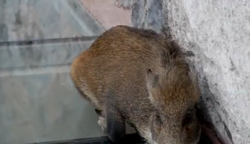 คลิปเผยให้เห็นเจ้าหมูป่าพยายามเดินชิดขอบหินด้านข้างสะพาน