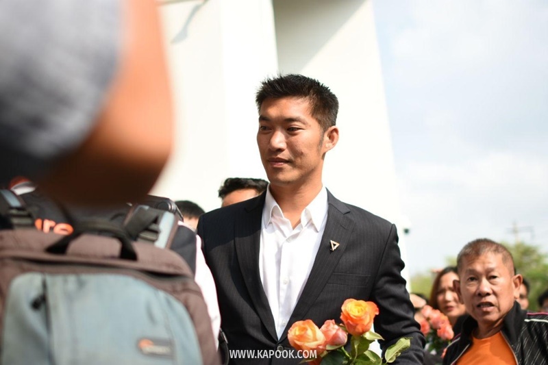 โดย นายธนาธร ได้เดินทางมาถึงศาลพร้อมภรรยา ทั้งคู่มีสีหน้ายิ้มแย้ม