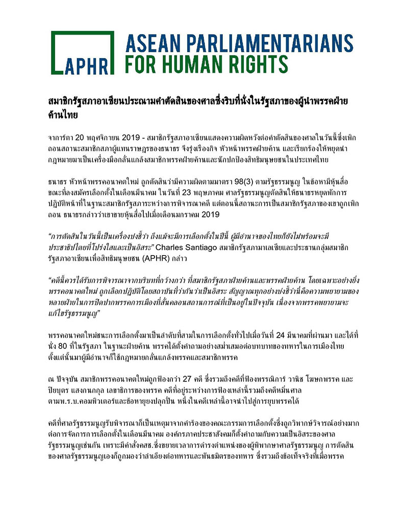 รัฐสภาอาเซียน แถลงการณ์ประณามหลังศาลรัฐธรรมนูญตัดสินให้ธนาธร พ้นสภาพ ส.ส. ร้อง อย่านำกฎหมายมาเป็นเครื่องมือกลั่นแกล้งสมาชิกพรรคฝ่ายค้าน