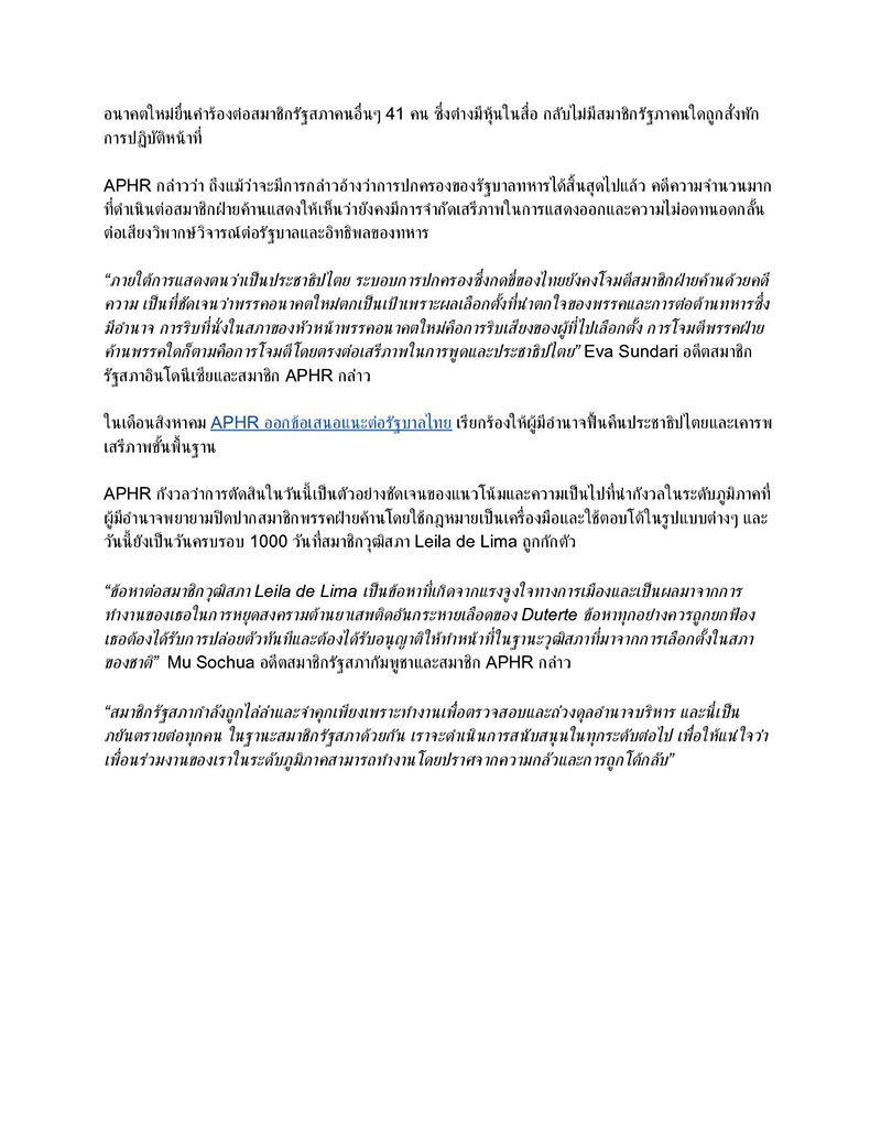 นอกจากนี้ ในแถลงการณ์ยังระบุอีกว่า ตอนนี้สมาชิกพรรคอนาคตใหม่ ถูกฟ้องกว่า 27 คดี ซึ่งคดีเหล่านี้อาจมีคดีใดคดีหนึ่งที่อาจนำไปสู่การยุบพรรคต่อไปได้ ขณะเดียวกัน ทางพรรคอนาคตใหม่ก็ได้ร้องเรียนสมาชิกรัฐสภาคนอื่น ๆ ในการถือหุ้นสื่อ แต่กลับไม่มีใครถูกสั่งพักการปฏิบัติหน้าที่เหมือนนายธนาธร