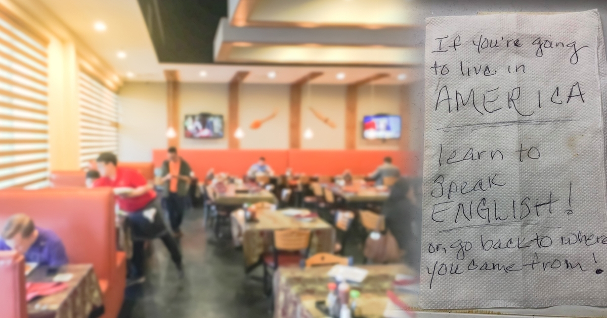 โดยข้อความระบุว่า "If you?re going to live in AMERICA learn to speak ENGLISH ! or, go back to where you came from !" ("ถ้าคุณจะอยู่ในอเมริกา ช่วยเรียนพูดภาษาอังกฤษด้วย หรือไม่ ก็กลับไปที่ที่คุณมา") ทางร้านจึงได้นำข้อความบนกระดาษแผ่นนี้มาโพสต์ พร้อมกับกล่าวขอโทษคุณลูกค้ารายนี้ซึ่งไม่ได้เกิดมาเป็นเช่นเขา