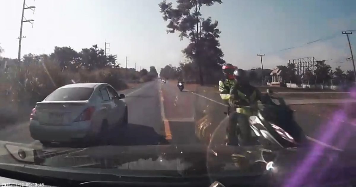 นาทีอุบัติเหตุรถยนต์ชนบิ๊กไบค์ รถยนต์ขับอยู่ในเลนดี ๆ หักพวงมาลัยแซงขวาออกไปชนคนขี่บิ๊กไบค์ กระเด็นลงข้างทาง เสียชีวิต 2 ราย