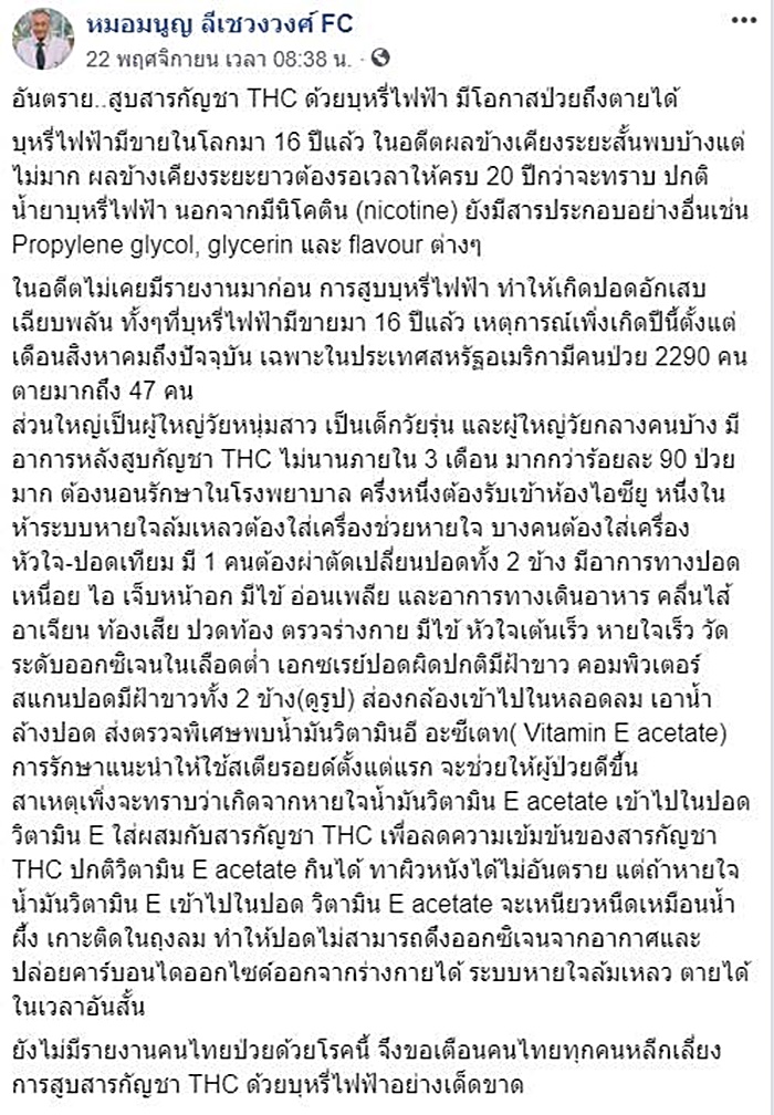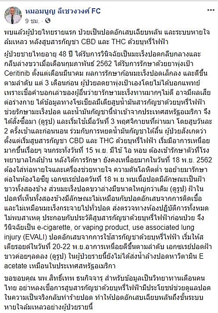 วันที่ 24 พฤศจิกายน 2562 นพ.มนูญ ลีเชวงวงศ์ หัวหน้าห้องไอซียู เฉพาะทางด้านโรคระบบการหายใจ ผู้ป่วยหนัก และโรคผู้สูงอายุ โรงพยาบาลวิชัยยุทธ ได้โพสต์ข้อความผ่านเฟซบุ๊ก หมอมนูญ ลีเชวงวงศ์ FC ระบุว่า มีชายไทยอายุ 48 ปี ป่วยเป็นโรคมะเร็งปอด ได้รับการรักษามาตั้งแต่ช่วงเดือนกุมภาพันธ์ 2562 จนมะเร็งมีขนาดเล็กลงเรื่อย ๆ แต่ช่วงหลังผู้ป่วยลดยาเองโดยไม่ได้บอกแพทย์ เพราะเชื่อว่าหากกินยารักษามะเร็งมาก ๆ จะไม่เกิดผลดี อีกทั้งได้รับข้อมูลทางโซเชียลมีเดียเกี่ยวกับการสูบน้ำมันกัญชาด้วยบุหรี่ไฟฟ้าจะช่วยรักษามะเร็งปอด