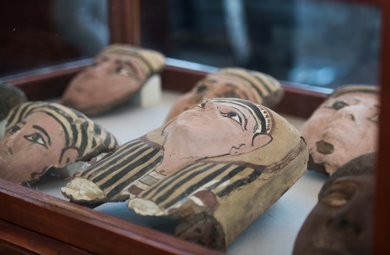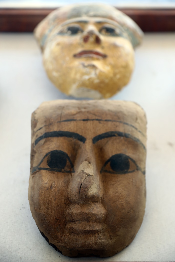 หน้ากากดินเผาถูกแต้มสีสันสำหรับโลงไม้ 8 อัน เครื่องรางดินเผาหลายสิบอัน