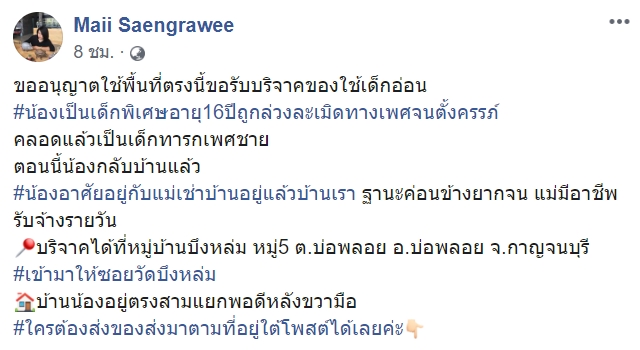 วันที่ 25 พฤศจิกายน 2562 เฟซบุ๊ก Maii Saengrawee ได้มีการเผยภาพหญิงคนหนึ่งกำลังให้นมลูก พร้อมข้อความว่า "ขออนุญาตใช้พื้นที่ตรงนี้ขอรับบริจาคของใช้เด็กอ่อน #น้องเป็นเด็กพิเศษ อายุ 16 ปี ถูกล่วงละเมิดทางเพศจนตั้งครรภ์ คลอดแล้วเป็นเด็กทารก เพศชาย ตอนนี้น้องกลับบ้านแล้ว #น้องอาศัยอยู่กับแม่เช่าบ้านอยู่ ฐานะค่อนข้างยากจน แม่มีอาชีพรับจ้างรายวัน