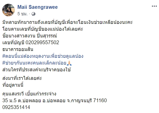 ตอนนี้แม่ต้องหยุดงานเพื่อช่วยดูแลน้อง ช่วย ๆ กันนะคะ คนละเล็กละน้อย ส่วนใครที่ประสงค์จะบริจาคของใช้ ส่งมาที่เราได้เลยค่ะ ที่อยู่ตามนี้ คุนแสงระวี เบี้ยแก้วกระจ่าง 35 ม.5 ต.บ่อพลอย อ.บ่อพลอย จ.กาญจนบุรี 71160 โทร. 092-535-1414"