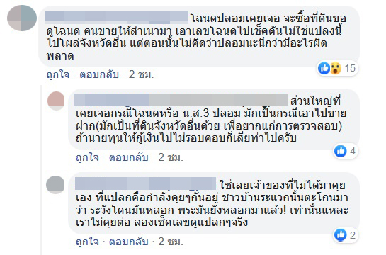 ขณะที่ชาวเน็ตเข้ามาแชร์ประสบการณ์ว่า เคยติดต่อขอซื้อที่ดินและได้ขอดูโฉนดจากคนขาย แต่คนขายที่กลับเอาสำเนามาให้ดู ซึ่งเมื่อนำไปตรวจสอบก็พบว่า ไม่ใช่ที่ดินแปลงนี้ แต่ดันไปโผล่จังหวัดอื่นแทน แต่ตอนนั้นไม่ได้คิดว่าเป็นโฉนดปลอม นึกว่ามีอะไรผิดพลาดเฉย ๆ