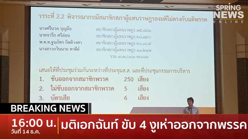 พรรคอนาคตใหม่ ลงมติ 250 เสียง ขับ 4 ส.ส. งูเห่า ศรีนวล, จารึก, ฐนภัทร, กวินนาถ ออกจากพรรค ปมลงมติไม่ตรงกับมติพรรค และสัมภาษณ์โจมตีพรรค
