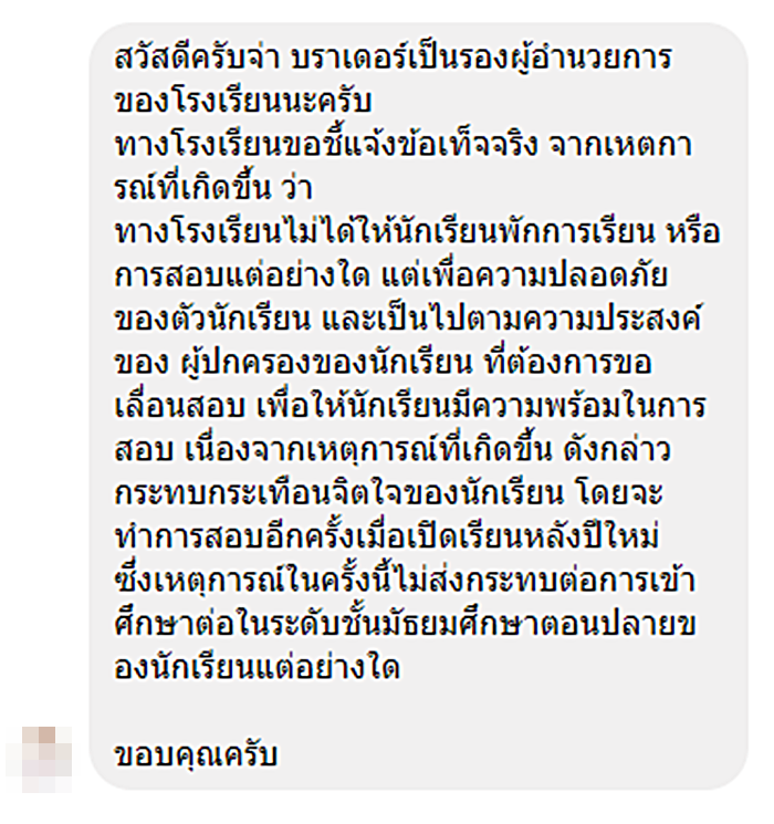 ทั้งนี้ รองผู้อำนวยการโรงเรียน ยืนยันว่า การให้หยุดนั้นเป็นเพื่อความปลอดภัยของเด็ก และจะไม่กระทบใด ๆ กับการสอบ และการเข้าศึกษาต่อในชั้นมัธยมศึกษาตอนปลายของนักเรียนแต่อย่างใด