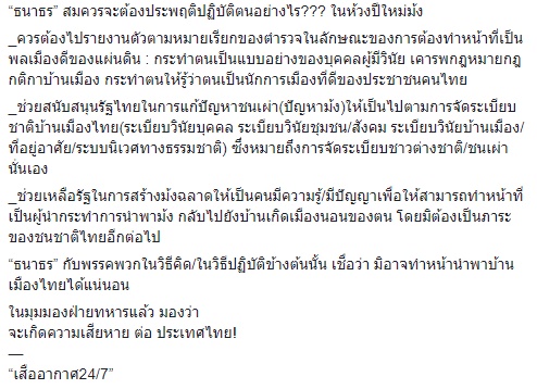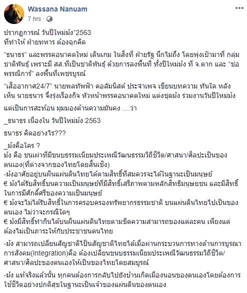 วันที่ 28 ธันวาคม 2562 ในโลกโซเชียลเน็ตเวิร์กต่างมีการแชร์บทความที่เขียนโดย เสืออากาศ24/7 ผ่านเฟซบุ๊ก Wassana Nanuam ของวาสนา นาน่วม ผู้สื่อข่าวสายทหารชื่อดัง เกี่ยวกับกรณีที่นายธนาธร จึงรุ่งเรืองกิจ หัวหน้าพรรคอนาคตใหม่ ได้ลงพื้นที่ชาวม้งทางภาคเหนือ