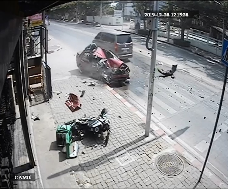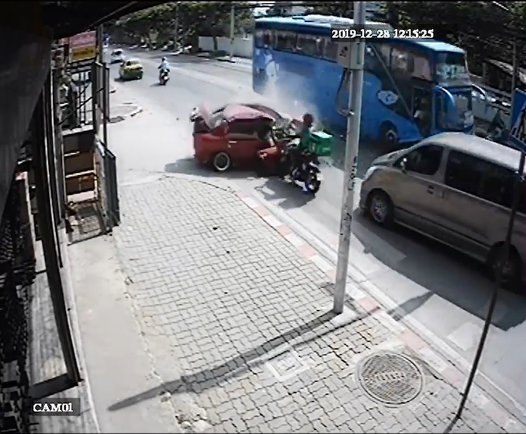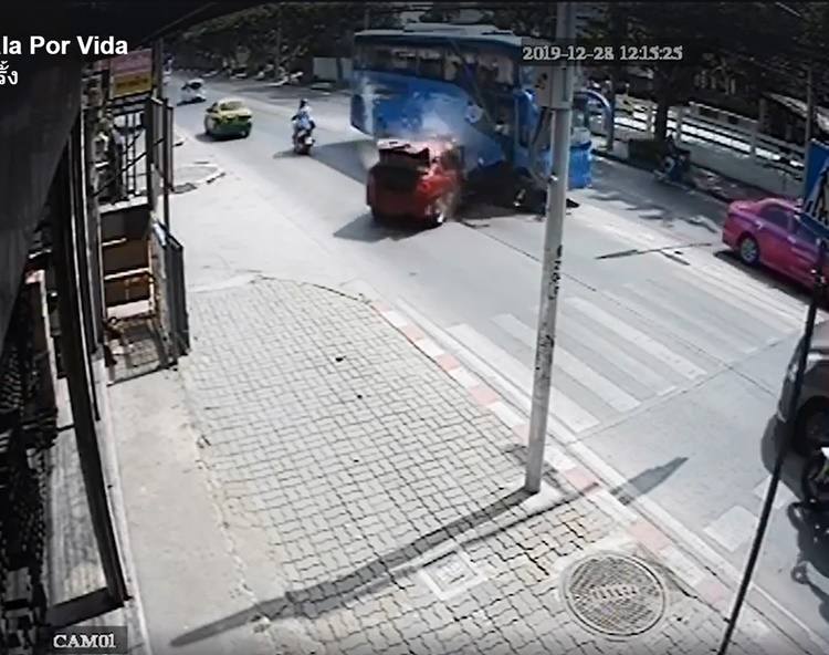 เมื่อวานนี้ (28 ธันวาคม 2562) เฟซบุ๊ก Impala Por Vida ได้มีการเผยแพร่คลิปวิดีโอที่บันทึกได้จากกล้องวงจรปิดที่สามารถจับภาพเหตุการณ์อุบัติเหตุรถบัสพุ่งชนประสานงารถเก๋งและรถจักรยานยนต์ ซึ่งจากคลิปเผยให้เห็นรถบัสขับลักษณะคร่อมเลน ก่อนชนกับรถยนต์ที่ขับสวนเลนมา และเป็นเหตุให้รถยนต์หมุนมาชนกับรถจักรยานยนต์อีกคัน