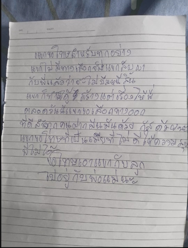นอกจากนี้ ยังพบจดหมายที่ทิ้งเอาไว้ ระบุว่า ตนขอโทษสำหรับทุกอย่าง