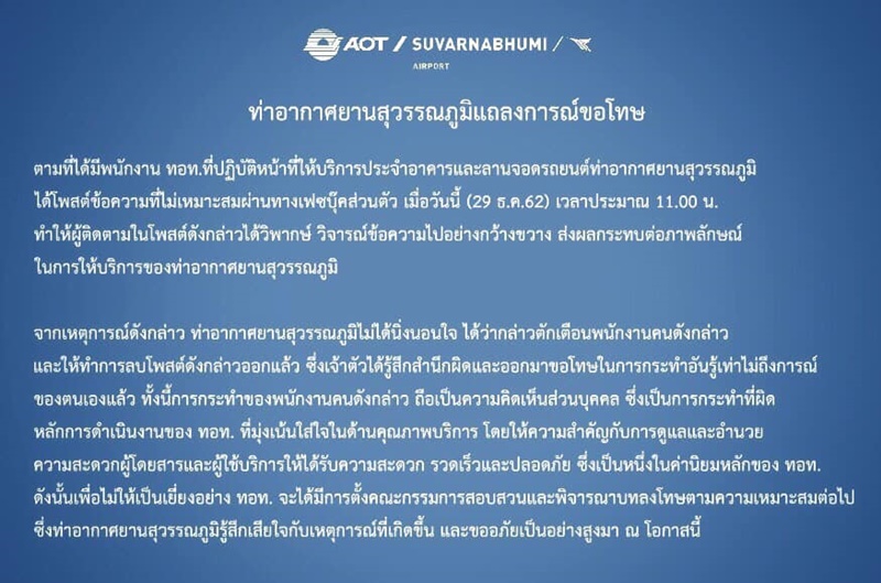 ล่าสุด (30 ธันวาคม 2562) เฟซบุ๊ก เที่ยงวันทันเหตุการณ์ ได้เผยแพร่ แถลงการณ์ขอโทษจากทางท่าอากาศยานสุวรรณภูมิ (ทอท.) โดยระบุว่า ทางท่าอากาศยานสุวรรณภูมิ ได้ทราบเรื่องราวดังกล่าวแล้ว และไม่ได้นิ่งนอนใจ โดยได้ดำเนินการ ตักเตือนและให้พนักงานลบโพสต์ดังกล่าวทิ้ง ส่วนเจ้าตัวรู้สึกสำนึกผิด และขอโทษต่อการกระทำที่รู้เท่าไม่ถึงการณ์