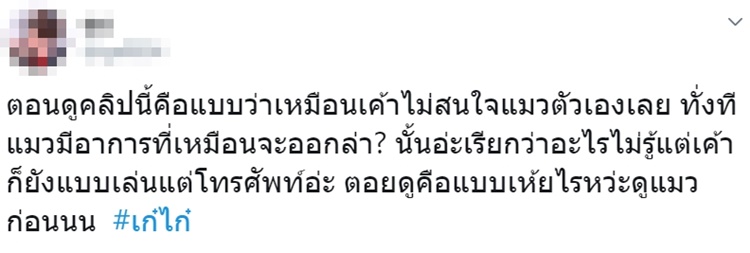 นอกจากนี้ยังมีการโพสต์คลิปวิดีโอ ซึ่งเผยให้เห็นภาพแมวป่าตัวดังกล่าว มีท่าทีคล้ายกับกำลังจะออกล่าเหยื่อ กระโจนเข้ามาใส่เก๋ไก๋ที่นอนเล่นโทรศัพท์มือถืออยู่บนโซฟา จากนั้นได้ตะปบใบหน้าหลายครั้ง ซึ่งโซเชียลมองว่าเป็นการไม่สนใจแมวของตัวเองเลย