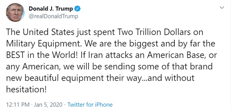ต่อมาในเวลา 12.11 น. ของวันที่ 5 มกราคม 2563 โดนัลด์ ทรัมป์ ได้ทวีตข้อความผ่านทางทวิตเตอร์ @realDonaldTrump ระบุว่า "สหรัฐอเมริกาเพิ่งทุ่มเงิน 2 ล้านล้านดอลลาร์ ไปกับอุปกรณ์ทางการทหาร เรามีอาวุธที่ดีที่สุดในโลก ! หากอิหร่านโจมตีฐานทัพอเมริกัน หรือประชาชนของเรา เราจะส่งอุปกรณ์ใหม่ไปที่นั่นทันที โดยไม่ลังเล"
