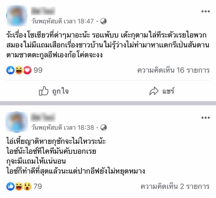 ขณะนี้ลูกสาวโดนโซเชียลโจมตีเยอะมาก จนไม่กล้าเล่นเฟซบุ๊ก ทั้งที่บางคนไม่รู้เรื่องก็เข้ามาด่าสนุกปาก ทำให้ลูกสาวเกิดอาการโมโห จึงได้โพสต์เฟชบุ๊กตอบกลับไป ตนเสียใจกับเหตุการณ์ที่เกิดขึ้น ไม่มีใครอยากให้เกิดเรื่องแบบนี้ พร้อมยอมรับว่าหลังเกิดเหตุครอบครัวถูกรุมประณามไปด้วย มีคนโทร. มาขู่ และด่าเสีย ๆ หาย ๆ และยืนยันว่าก่อนเกิดเหตุลูกสาวเกิดอาการวูบ พอรู้ตัวอีกทีก็ชนเสาไฟฟ้าแล้ว