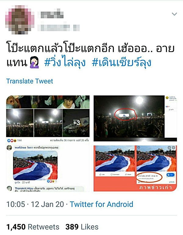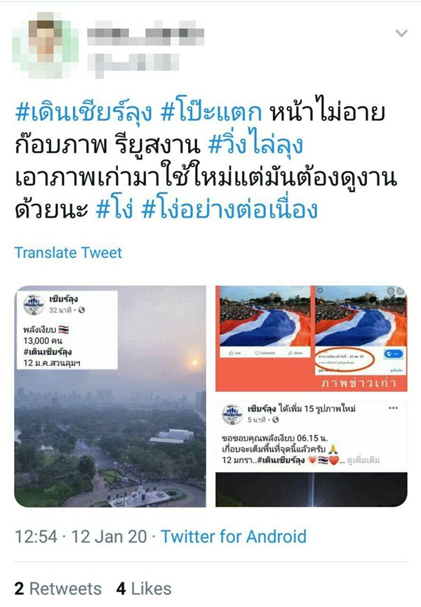 วันนี้เป็นวันที่มีกิจกรรมใหญ่ 2 งาน คือ งาน #วิ่งไล่ลุง ที่สวนรถไฟ และงาน #เดินเชียร์ลุง ที่สวนลุมฯ ซึ่งทั้ง 2 กิจกรรมก็มีผู้เข้าร่วมงานเป็นจำนวนมาก อย่างไรก็ตาม บนโลกออนไลน์ได้มีการจับโป๊ะ เพจเชียร์ลุง ซึ่งพบว่าโป๊ะแตกหลายครั้ง ด้วยการนำภาพเก่ามาใช้ รวมทั้งนำภาพของงาน #วิ่งไล่ลุง มาโพสต์รวมกับรูปอื่น ๆ ในงานตัวเอง