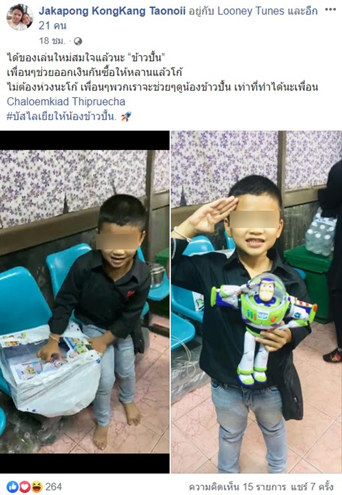 ซึ่งทางเพื่อน ๆ ของโก้ได้รวมเงินกันซื้อของเล่นให้กับน้องข้าวปั้น ถือเป็นเรื่องราวที่สามารถเรียกรอยยิ้มจากเด็กตัวน้อย ๆ ได้ แม้จะผ่านเรื่องเศร้าที่สุดในชีวิตมา โดยเพื่อน ๆ ยืนยันว่า จากนี้จะช่วยกันดูแลลูกของโก้ ให้ดีที่สุดเท่าที่จะทำได้