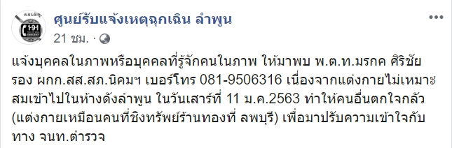 ซึ่งทางเพจระบุข้อความว่า แจ้งบุคคลในภาพหรือบุคคลที่รู้จักคนในภาพ ให้มาพบ พ.ต.ท. มรกต ศิริชัย รอง ผกก.สส.สภ.นิคมอุตสาหกรรม จ.ลำพูน เบอร์โทร. 081-9506316 เนื่องจากแต่งกายไม่เหมาะสมเข้าไปในห้างดังลำพูน ในวันเสาร์ที่ 11 มกราคม 2563 ทำให้คนอื่นตกใจกลัว (แต่งกายเหมือนคนที่ชิงทรัพย์ร้านทองที่ลพบุรี) เพื่อมาปรับความเข้าใจกับทางเจ้าหน้าที่ตำรวจ