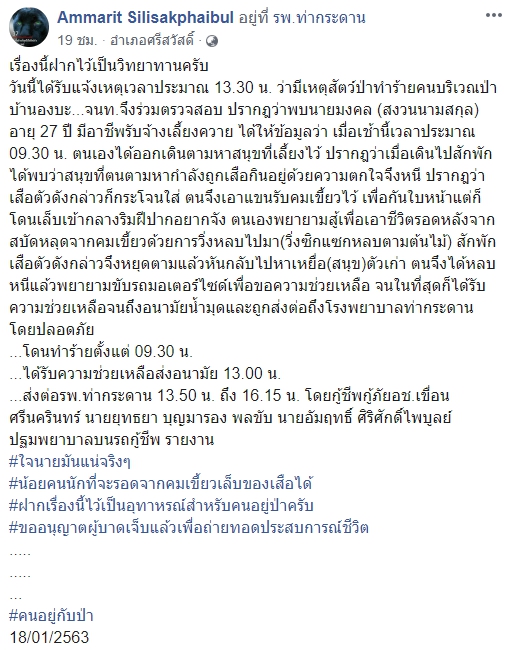 เป็นอุทาหรณ์เมื่อต้องเข้าป่า โดยเมื่อวันที่ 18 มกราคม 2563 ผู้ใช้เฟซบุ๊ก Ammarit Silisakphaibul พนักงานพิทักษ์ป่า ที่น้ำตกห้วยแม่ขมิ้น อุทยานแห่งชาติเขื่อนศรีนครินทร์ เผยภาพและเรื่องราวของ นายมงคล อายุ 27 ปี หนุ่มรับจ้างเลี้ยงควาย โดยมีสภาพบาดเจ็บ เลือดออกหลายจุดตามร่างกาย ต้นเหตุมาจากที่ถูกเสือเข้าทำร้ายจนเกือบเอาชีวิตไม่รอด