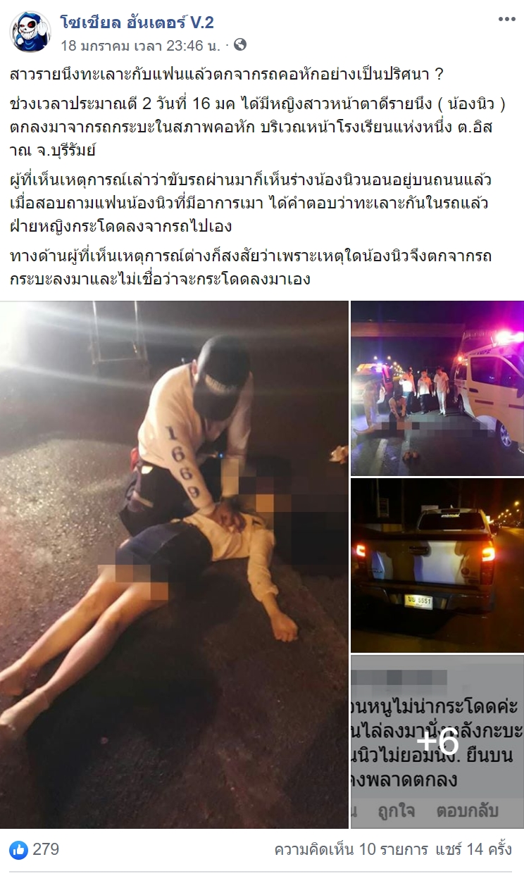 จากกรณี เพจเฟซบุ๊ก โซเชียล ฮันเตอร์ V.2 โพสต์เรื่องราวหญิงสาวคนหนึ่งเสียชีวิตกลางถนน ที่ จ.บุรีรัมย์ ในสภาพคอหัก เหตุเกิดคืนวันที่ 16 มกราคม 2563 ซึ่งเบื้องต้นคาดว่าสาเหตุการเสียชีวิตเกิดจากเจ้าตัวตกจากท้ายรถกระบะของแฟนหนุ่ม