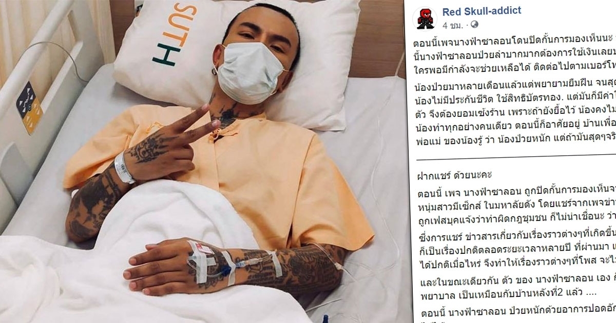 วันที่ 22 มกราคม 2563 แฟนเพจ Red Skull-addict ได้มีการโพสต์ข้อความขอความช่วยเหลือ เนื่องจาก นางฟ้าซาลอน หรือที่หลายคนรู้จักจากความเป็นผู้ให้ คอยช่วยเหลือคนยากจน คนพิการ กำลังล้มป่วย ลำบากมากต้องการใช้เงินเลยประกาศเซ้งร้านเสริมสวย น้องป่วยมาหลายเดือนแล้วแต่พยายามยืมฝืน จนสุดท้ายมันไม่ไหวจริง ๆ น้องไม่มีประกันชีวิต ใช้สิทธิบัตรทอง แต่มันก็มีค่าใช้จ่ายอื่น ๆ ระหว่างรักษาตัว จึงต้องยอมเซ้งร้าน เพราะถ้ายังยื้อไว้ น้องคงไม่มีเงินจ่ายค่าเช่า ตอนนี้ก็อาศัยอยู่บ้านเพื่อน เพราะยังปิดบังไม่ให้พ่อแม่รู้ว่าป่วยหนัก