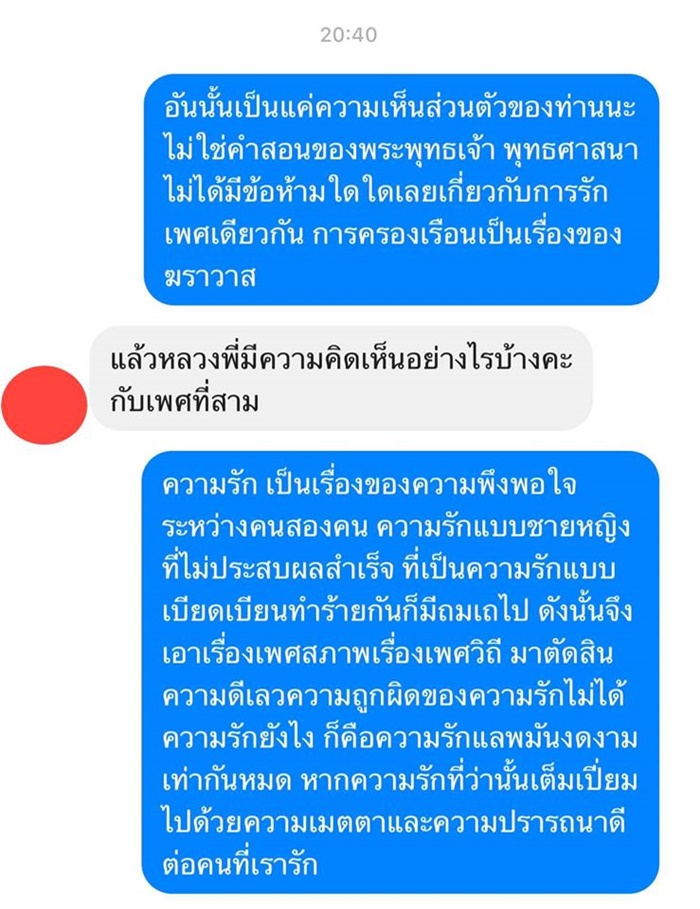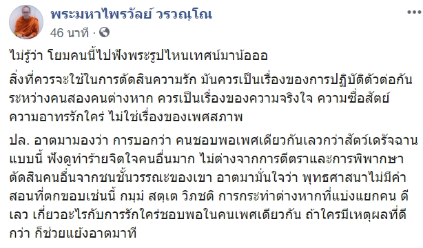 โดย พระมหาไพรวัลย์ ตอบกลับว่า อันนั้นเป็นแค่ความเห็นส่วนตัวของท่าน ไม่ใช่คำสอนของพระพุทธเจ้า พุทธศาสนาไม่ได้มีข้อห้ามใด ๆ เกี่ยวกับการรักเพศเดียวกัน การครองเรือนเป็นเรื่องของฆราวาส ความเห็นของหลวงพี่ ความรักเป็นเรื่องของความพึงพอใจระหว่างคนสองคน อย่าเอาเรื่องเพศสภาพมาตัดสินความดี-เลว ความถูก-ผิดของความรักไม่ได้