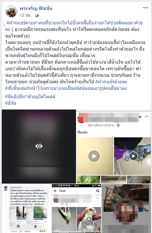 วันที่ 5 กุมภาพันธ์ 2563 เฟซบุ๊ก พรเจริญ ฟิชชิ่ง ได้โพสต์ภาพและข้อความระบุตามล่าตัวหนุ่มรายหนึ่งที่มีพฤติกรรมบีบนกจนตายคามือ พร้อมถ่ายคลิปวิดีโอไปโพสต์ลงกลุ่มคนรักนกหลายกลุ่มในเฟซบุ๊ก โดยเจ้าของเฟซบุ๊กระบุว่า คาดว่าหนุ่มรายนี้น่าจะซื้อมาฆ่าหลายตัวแล้ว