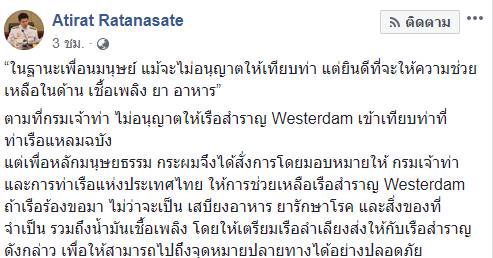 ตามที่กรมเจ้าท่า ไม่อนุญาตให้เรือสำราญ Westerdam เข้าเทียบท่าที่ท่าเรือแหลมฉบัง แต่เพื่อหลักมนุษยธรรม กระผมจึงได้สั่งการโดยมอบหมายให้ กรมเจ้าท่า และการท่าเรือแห่งประเทศไทย ให้การช่วยเหลือเรือสำราญ Westerdam ถ้าเรือร้องขอมา ไม่ว่าจะเป็น เสบียงอาหาร ยารักษาโรค และสิ่งของที่จำเป็น รวมถึงน้ำมันเชื้อเพลิง โดยให้เตรียมเรือลำเลียงส่งให้กับเรือสำราญดังกล่าว เพื่อให้สามารถไปถึงจุดหมายปลายทางได้อย่างปลอดภัย"