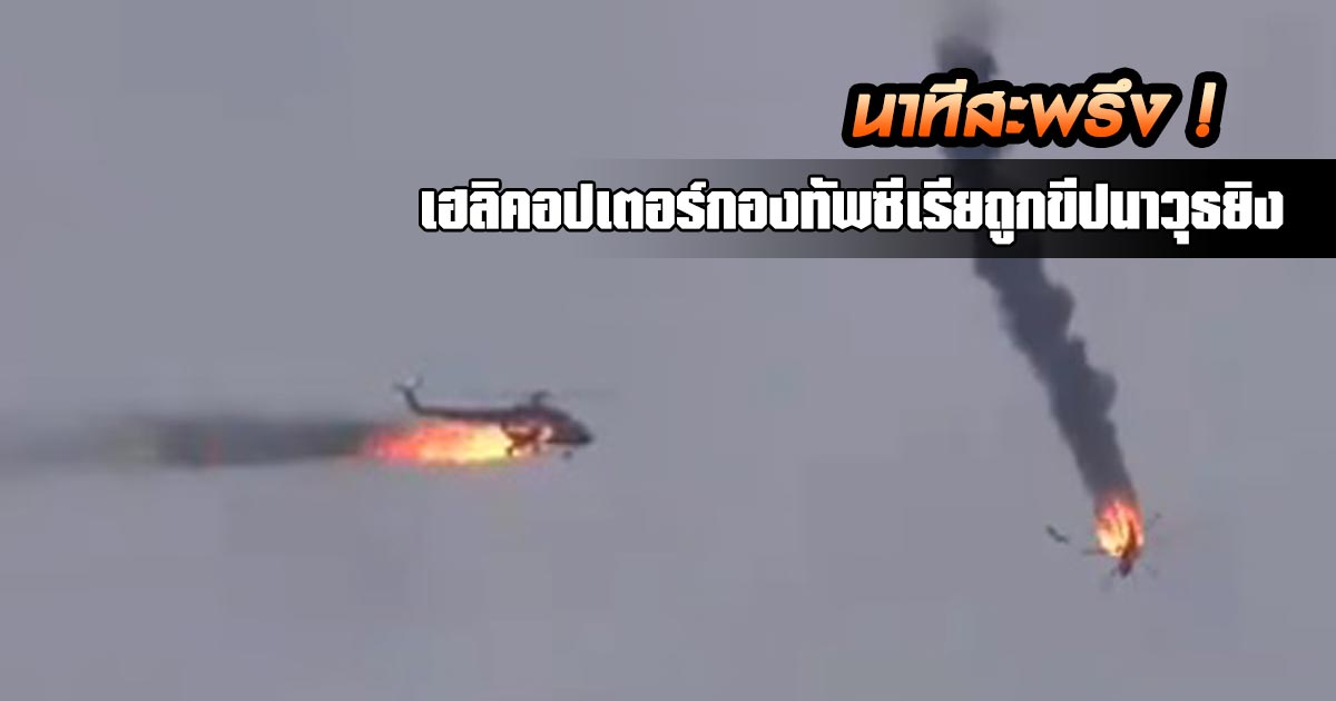 คลิปเผยนาทีสะพรึง เฮลิคอปเตอร์กองทัพซีเรียถูกขีปนาวุธของกลุ่มกบฏยิง ระเบิดไฟลุกกลางอากาศ เศษซากกระจาย