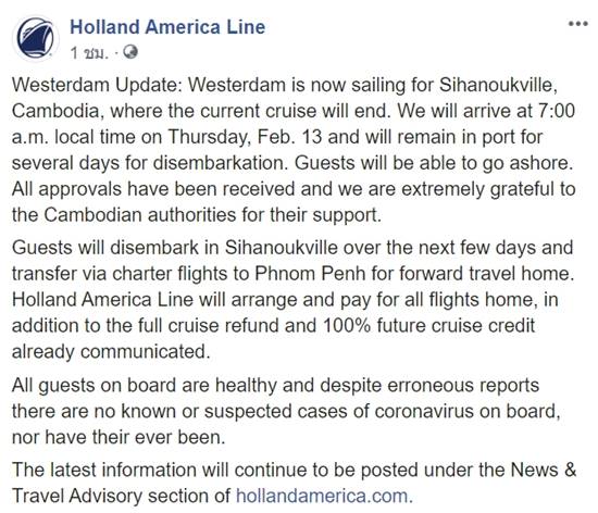 ทั้งนี้ ผู้เข้าพักจะลงเรือที่สีหนุวิลล์ จากนั้นจะขึ้นเครื่องบินแบบเช่าเหมาลำเดินทางไปพนมเปญ เพื่อต่อเครื่องบินเดินทางกลับภูมิลำเนา ซึ่งทางบริษัทจะรับผิดชอบค่าใช้จ่าย และจะคืนเงินทั้งหมดให้ผู้โดยสาร อย่างไรก็ตาม ขอยืนยันว่าแขกทุกคนบนเรือมีสุขภาพดี ไม่มีใครติดเชื้อไวรัสโคโรนา