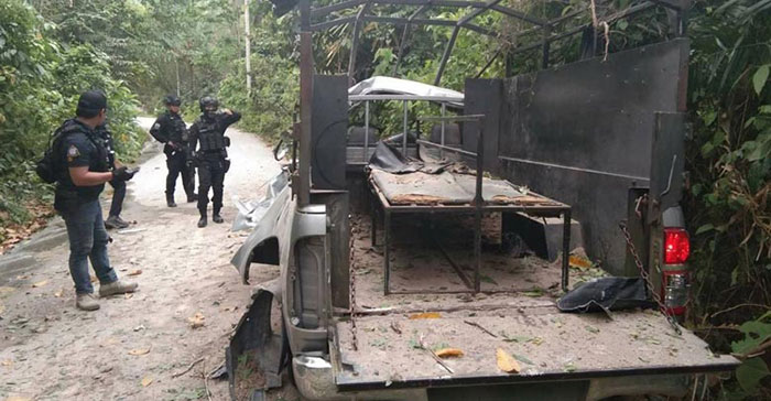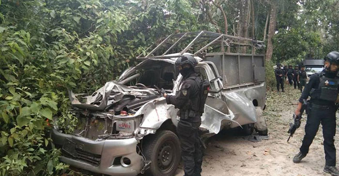 พบที่บริเวณโคนต้นไม้ริมถนนเป็นหลุมลึก 40 เซนติเมตร กว้าง 100 เซนติเมตร และมีเศษซากชิ้นส่วนของแสวงเครื่องที่คนร้ายประกอบใส่ไว้ในถังแก๊สปิกนิค หนัก 25 กิโลกรัม จุดชนวนด้วยวิทยุสื่อสาร ตกกระจายเกลื่อนพื้นถนนและพงหญ้ารกทึบริมทาง และฝั่งตรงข้าม เจ้าหน้าที่พบรถยนต์กระบะยี่ห้อโตโยต้า สีบรอนส์ ไม่ติดแผ่นป้ายทะเบียน จอดอยู่ในสภาพถูกอานุภาพระเบิดได้รับความเสียหายทั้งคัน เจ้าหน้าที่จึงได้เก็บรวบรวมหลักฐานในที่เกิดเหตุ