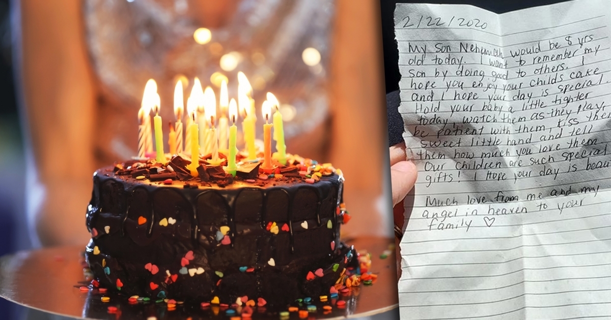 ในกระดาษแผ่นนั้น มีข้อความระบุว่า "วันที่ 22 กุมภาพันธ์ 2020 วันนี้ เนเฮเมียห์ ลูกชายของฉันจะอายุครบ 8 ขวบ ฉันอยากจะระลึกถึงลูกชาย โดยการทำดีให้คนอื่น ฉันหวังว่าคุณจะกินเค้กวันเกิดกับลูก ๆ อย่างมีความสุข ขอให้เป็นวันที่แสนพิเศษของคุณนะ กอดลูกของคุณให้แน่น ๆ ในวันนี้ นั่งมองพวกเขาเล่นสนุก อดทนใจเย็น จูบเจ้าตัวน้อย และบอกไปว่าคุณรักพวกเขามากแค่ไหน ลูกของเราคือของขวัญที่พิเศษที่สุดแล้ว หวังว่าจะเป็นวันที่สวยงามของคุณ ด้วยรัก.. จากฉัน และเทวดาตัวน้อยบนสวรรค์"