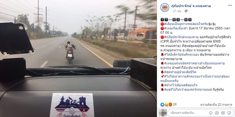 จากกรณี เพจเฟซบุ๊ก กู้ภัยประจักษ์ จ.หนองคาย ได้มีการโพสต์เรื่องราวเจอเด็กวัยรุ่นขี่รถจักรยานยนต์ขวางหน้ารถกู้ภัย ขณะกำลังจะเดินทางไปช่วยเหลือผู้ป่วยที่บ้าน ทำให้การเดินทางล่าช้า จนเป็นเหตุให้ผู้ป่วยเสียชีวิต