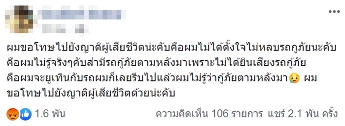 เด็กแว้นโพสต์ข้อความขอโทษญาติผู้เสียชีวิต หลังถูกแฉขี่รถขวางทางกู้ภัย อ้างไม่รู้ตัว ชี้กำลังจะขี่ไปกลับรถ ด้านเพื่อนโผล่แก้ตัวให้ บอกเตรียมจะบวชให้คนตายแล้ว