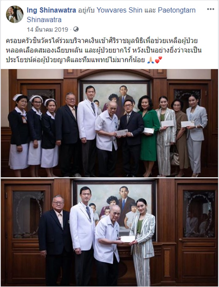 ภายหลังข่าวถูกนำเสนอออกไป ล่าสุด (1 เมษายน 2563) มีชาวเน็ตหลายคนจับได้ว่า ภาพและเหตุการณ์ที่ลงข่าวไปนั้น เป็นโพสต์เก่าเมื่อวันที่ 14 มีนาคม 2562 ซึ่ง อุ๊งอิ๊ง แพทองธาร ระบุว่า ครอบครัวชินวัตรได้ร่วมบริจาคเงินเข้าศิริราชมูลนิธิ เพื่อช่วยเหลือผู้ป่วยหลอดเลือดสมองเฉียบพลัน และผู้ป่วยยากไร้ หวังเป็นอย่างยิ่งว่าจะเป็นประโยชน์ต่อผู้ป่วยญาติและทีมแพทย์ไม่มากก็น้อย