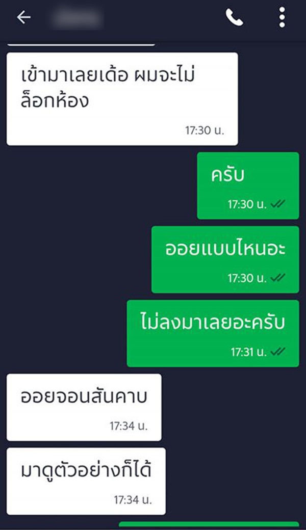 ตอนเห็นรูปก็เอะใจ คิดว่าทำไมลูกค้ากล้าถ่ายอย่างนี้ แต่ตอนนั้นคิดว่ารับงานแล้ว ถ้ากดยกเลิกงานก็จะเสียประวัติ จึงคิดว่ารีบส่งให้ลูกค้าดีกว่า แต่ลูกค้าไม่ลงมาด้านล่าง จึงคิดว่าลูกค้าคงกำลังอาบน้ำหรือทำอย่างอื่นอยู่ ตนจึงขึ้นไปที่ห้อง แต่เมื่อเปิดประตูเข้าไปเห็นลูกค้านอนใช้ผ้าปิดตาและใส่กางเกงในตัวเดียว ทาออยล์ที่ท้องและที่เป้ากางเกง ตอนนั้นตกใจมาก และรีบหยิบโทรศัพท์ถ่ายรูปไว้ได้
