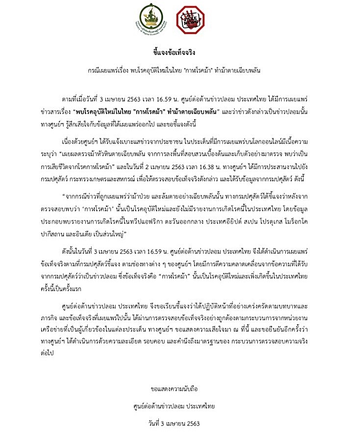 ศูนย์ต่อต้านข่าวปลอม ประเทศไทย แจงข่าว พบ กาฬโรคม้า เป็นโรคอุบัติใหม่ ทำม้าตายเฉียบพลัน ไม่ใช่ความจริง ด้านกรมปศุสัตว์แจง ยังไม่มีรายงานในไทย