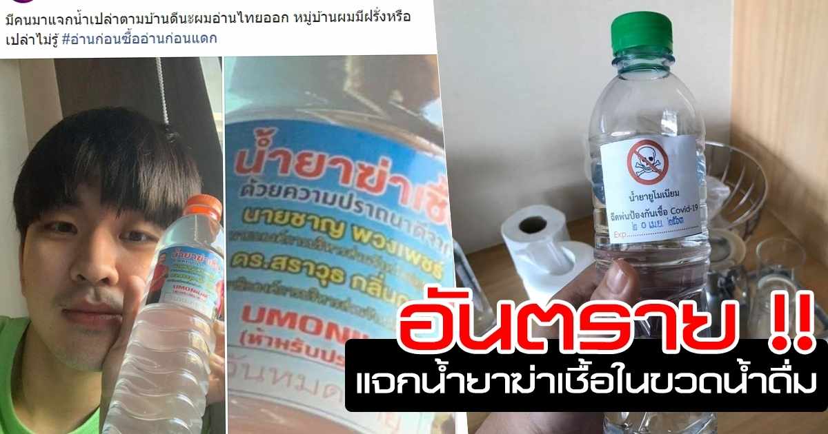 เพจหมอ เตือนอันตราย หลังหน่วยงานราชการแจกน้ำยาฆ่าเชื้อ โควิด 19 ใส่ขวดน้ำดื่มใส คนเข้าใจผิดหยิบมาดื่ม จนต้องหามส่งโรงพยาบาลธรรมศาสตร์ 6 ราย