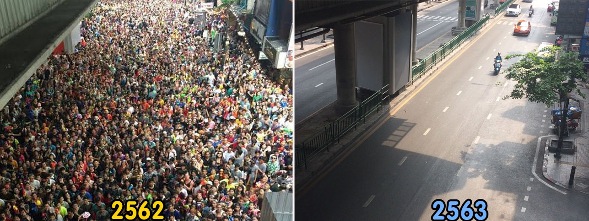 เปิดภาพเปรียบเทียบ สงกรานต์ที่สีลม ปี 2562 VS 2563 กับบรรยากาศอันเงียบสงัด
