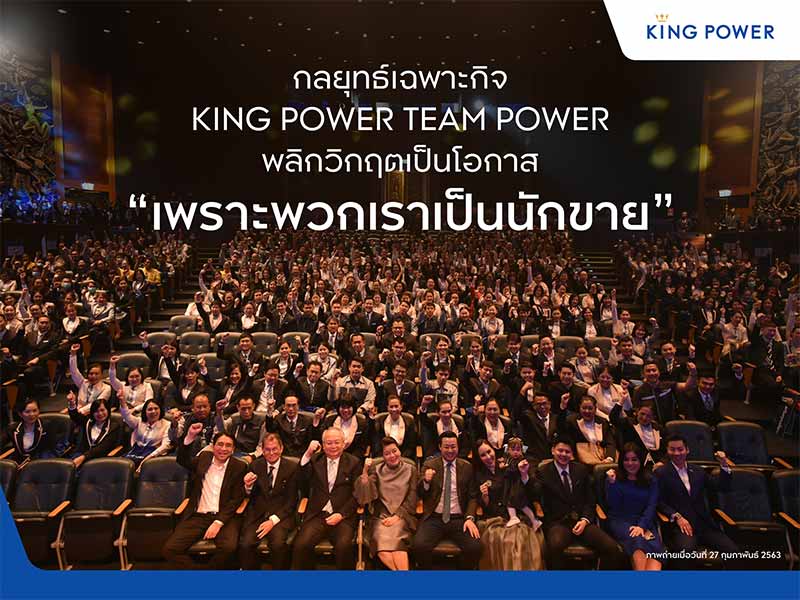 จากสภาวะผกผันที่ได้รับผลกระทบจากโควิด-19 กลุ่มบริษัท คิง เพาเวอร์ พลิกแผนธุรกิจครั้งประวัติศาสตร์! ด้วยกลยุทธ์ KING POWER TEAM POWER ที่จะเปลี่ยนพนักงานทุกส่วนเป็น นักขายสินค้าออนไลน์มืออาชีพ ให้องค์กรขยายเครือข่ายจาก ออนกราวน์ สู่ ออนไลน์ โดยแผนธุรกิจดังกล่าวจะเกิดประโยชน์กับทั้งพันธมิตรทางการค้า พนักงานและลูกค้าอย่างสูงสุด อีกทั้งตอบโจทย์มาตรการ Social Distancing #อยู่บ้านหยุดเชื้อเพื่อชาติ ที่เน้นให้ทุกคนไม่ต้องเดินทางออกจากบ้านหรือให้การออกนอกบ้านเป็นไปในระดับน้อยที่สุด
